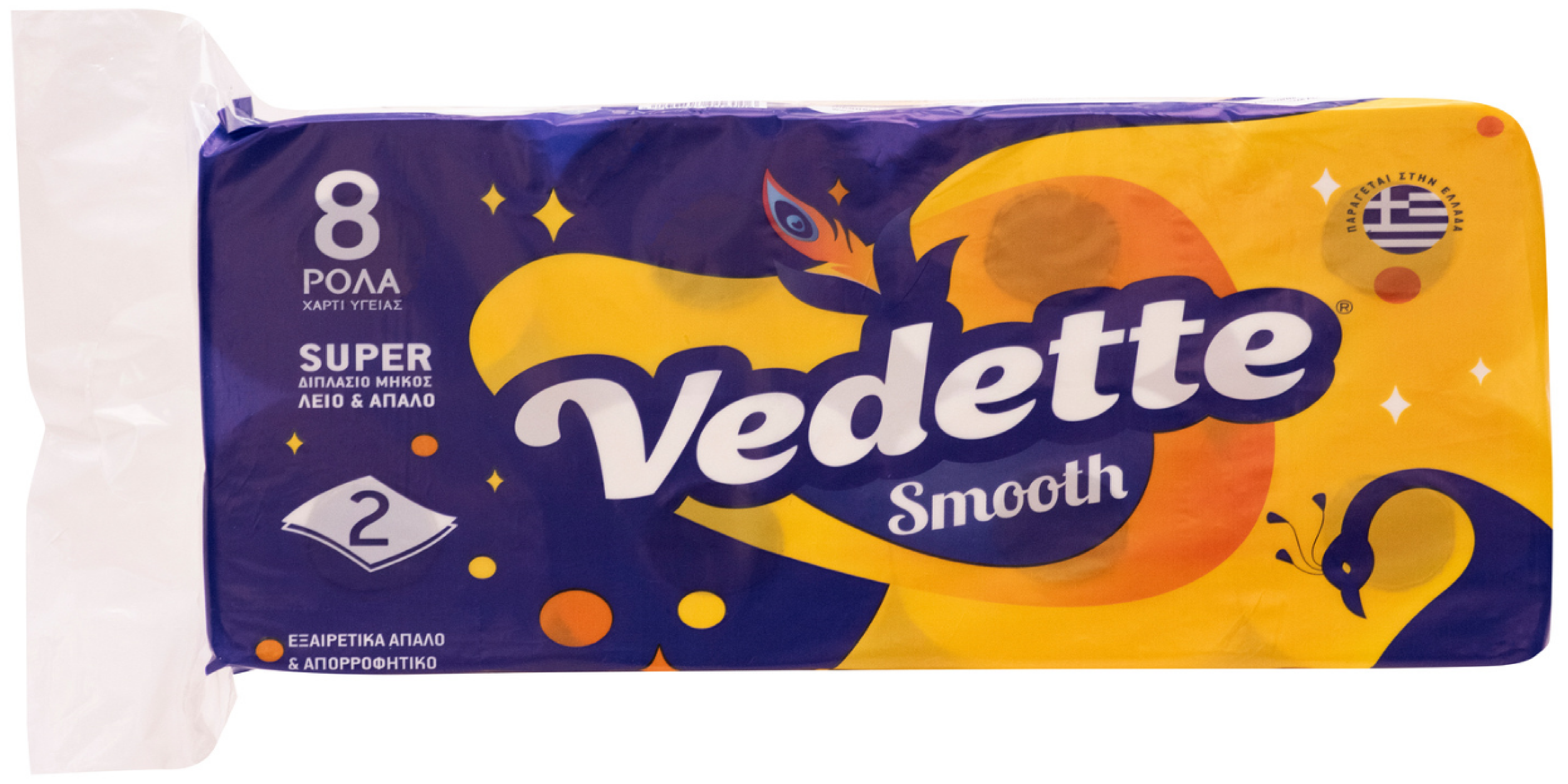 Το Χαρτί Υγείας Vedette 3φ. 8x105g είναι μία συσκευασία 8 ρολών. Το κάθε ρολλό έχει 168 διπλά φύλλα κολλημένα μεταξύ τους. Το βάρος ανά ρολού είναι 105 γραμμάρια. Το μήκος κάθε ρολού ειναι 21 μέτρα.